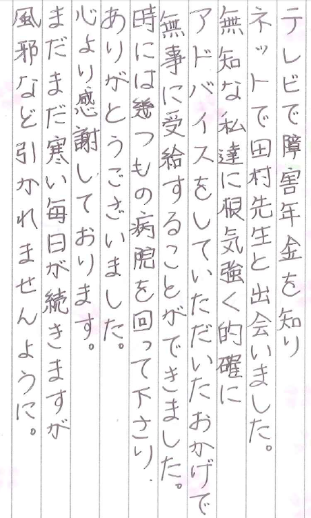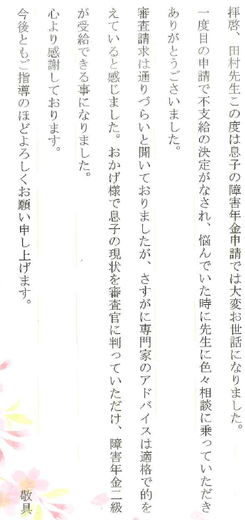 このたび、障害年金の申請に関し、お心のこもったお世話をいただき、誠にありがとうございました。